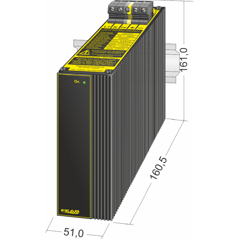 This power supply is optimally suited for loads requiring high starting current. Because of its robust design, casted in a rugged aluminium housing, it is particularly suitable for being used in rough industrial environment, e.g. in shipbuilding. Furthermore it is quite insensitive to surge voltages.