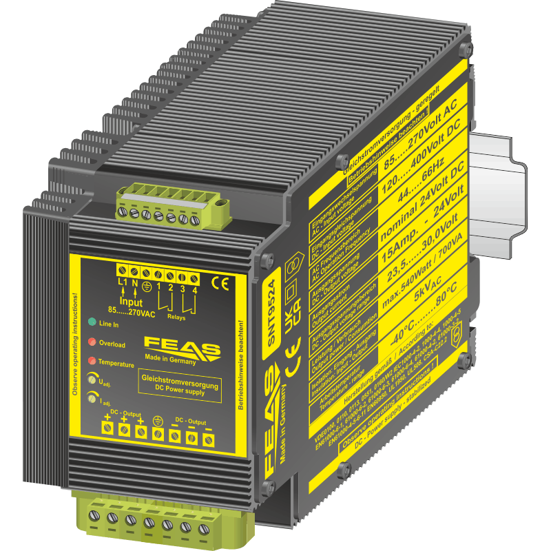 The switch-mode power supplies of the SNT95 series are powerful and robust devices to power sensitive loads in a hard industrial environment. These features result from the modern construction with a good radio shielding and high reliability integrated in a functional and stable casing. The short circuit proof output DC voltage of this type can be adjusted. The output current can rise to 130% of rating, therefore this power supply is suitable for loads requiring high starting current.