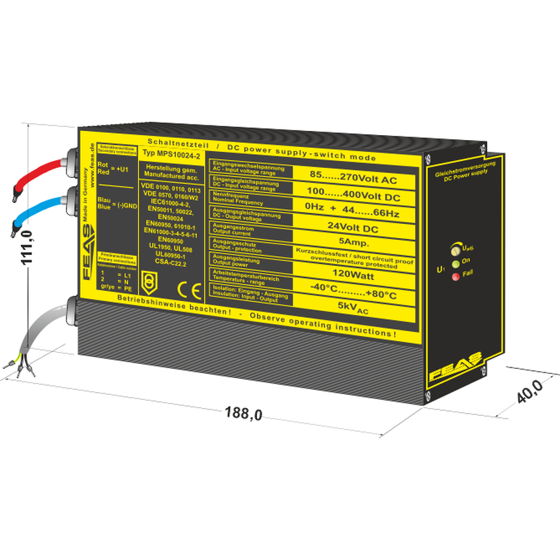Die Netzteile der Serie MPS100 sind leistungsfähige und robuste Schaltnetzteile zur Versorgung von empfindlichen Verbrauchern in rauer Industrieumgebung. Diese Eigenschaften ergeben sich unter anderem dadurch, dass moderne Konstruktion mit guter Funkentstörung und hoher Funktionssicherheit in ein funktionelles und stabiles Gehäuse integriert sind. Die kurzschlussfeste Ausgangsgleichspannung ist einstellbar. Das Netzgerät ist bestens für Lasten geeignet, die einen hohen Anlaufstrom benötigen.